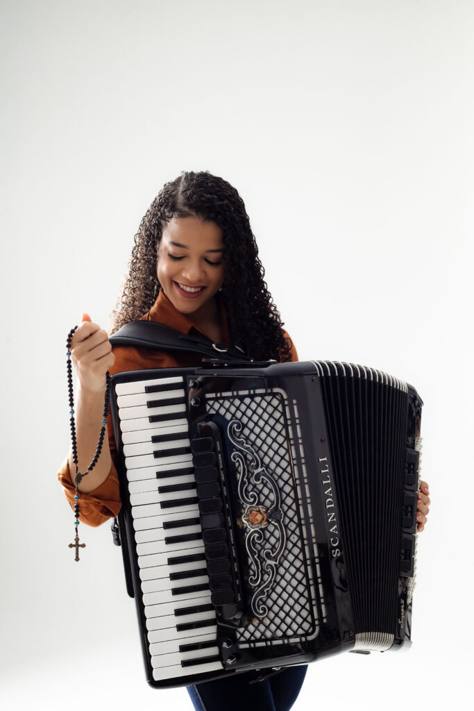 “Comecei a tocar acordeon aos 8 anos, aprendendo por meio de cursos online. Sempre fui inspirada pelos grandes mestres do forró pé de serra, como Luiz Gonzaga e Dominguinhos, e sou apaixonada por manter viva essa tradição.”
