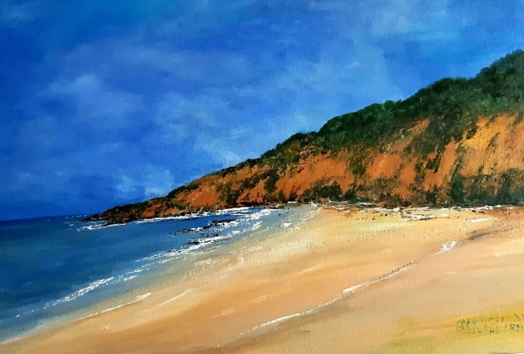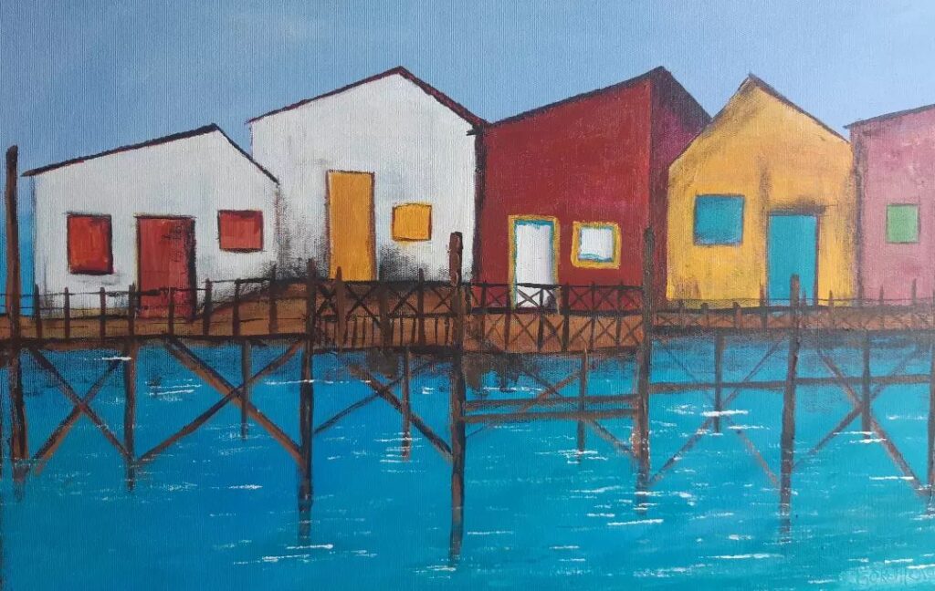 Quero dizer com isso que seu desenho expressa um exímio domínio em elaborar os contornos e sugerir a perspectiva por meio do uso preciso das pinceladas, mormente nas marinas ou paisagens cuja temática é uma nesga de mar. Com efeito, o pincel obedece docemente às oscilações de ascender ou descer, como sucede nos morros que barram as águas ou dividem as praias.