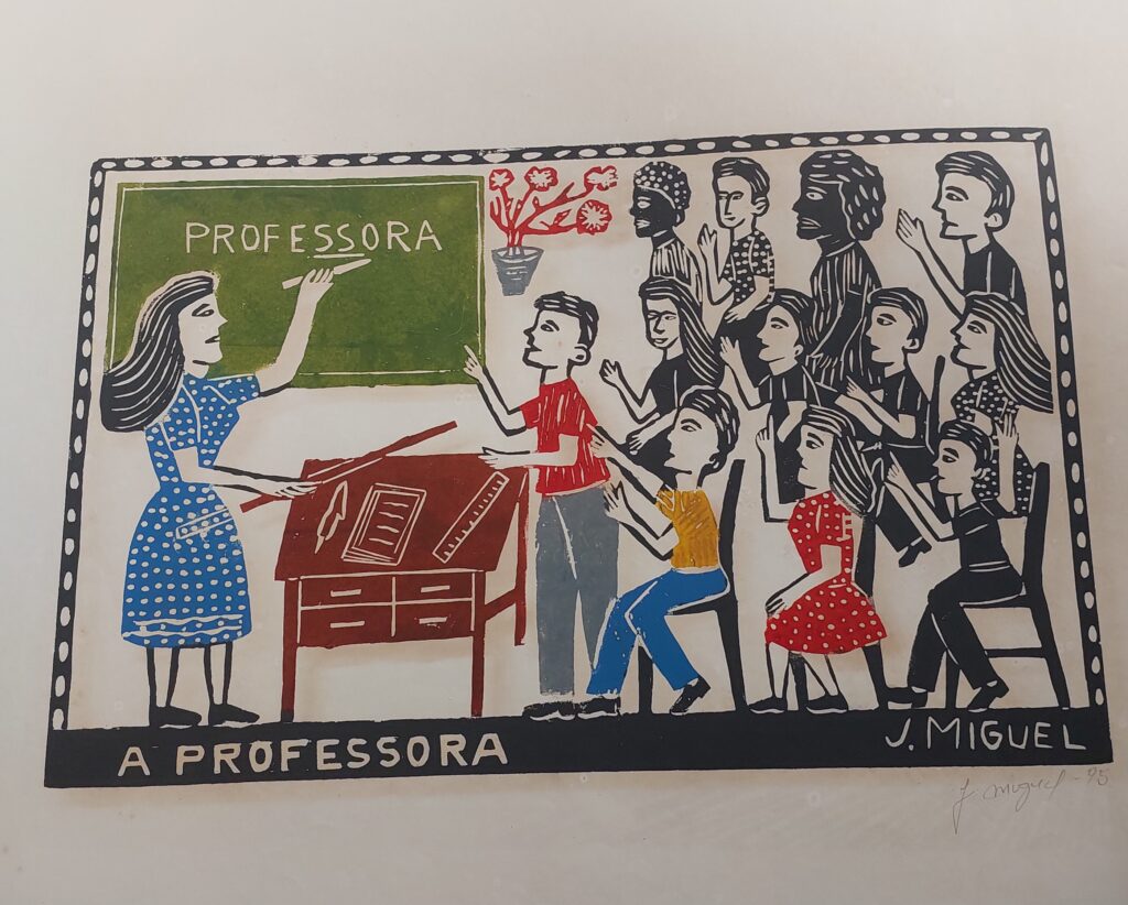 Das obras O Frevo e A Professora tive acesso apenas às versões coloridas, o que é um primor que dá tanto gosto de ver, evocando, o primeiro, o carnaval no Recife Velho. No segundo, há uma lousa com o nome de PROFESSORA; do lado direito, os alunos estão integrados à lição do dia, com a mão direita levantada, denotando entusiasmo e ânsia pelo aprender. Trata-se de uma obra de arte tanto na forma quanto na temática. Com efeito, é uma sala de aula de outrora, quando não havia celulares, quando educar era coisa da família e ensinar a contar, a ler e escrever, bem como os conhecimentos gerais de geografia e história diziam respeito à escola e a seu corpo de professores. Nesse caso, temos uma legítima homenagem àquela que traz o conhecimento e repassa para uma turma animada em aprender. A professora está reproduzida em colorido, bem como os três primeiros alunos mais próximos do birô.