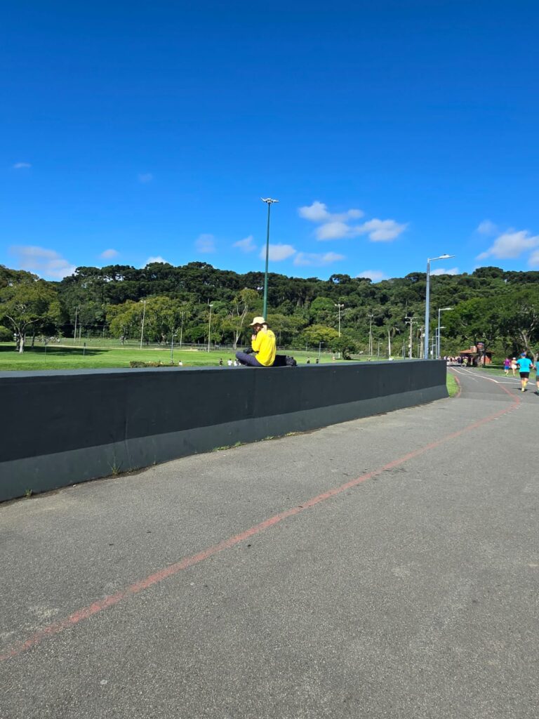 Logo pensei qual “seria a reação de um daqueles fotógrafos ao ouvir esse trecho da música?” Desacelerei a corrida, pairou novamente o ar de curiosidade em mim (e também o ar dos pulmões voltou!!! ahhhhh como é bom respirar!), olhei adiante e lá estava ele: “o personagem principal deste texto estava lá, sentado na mureta da ponte que corta o Parque, com aquele tal colete amarelo de fotógrafo, segurando uma daquelas lentes fotográficas que certamente não mentem!”